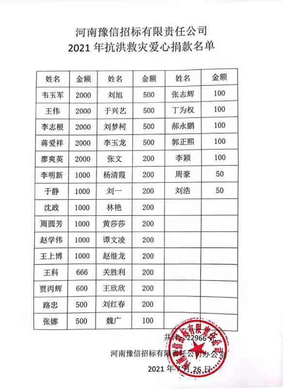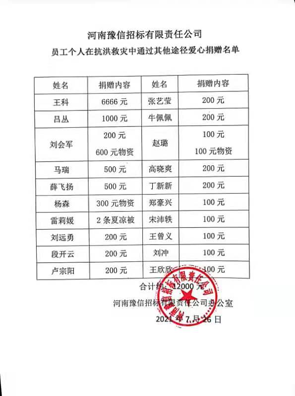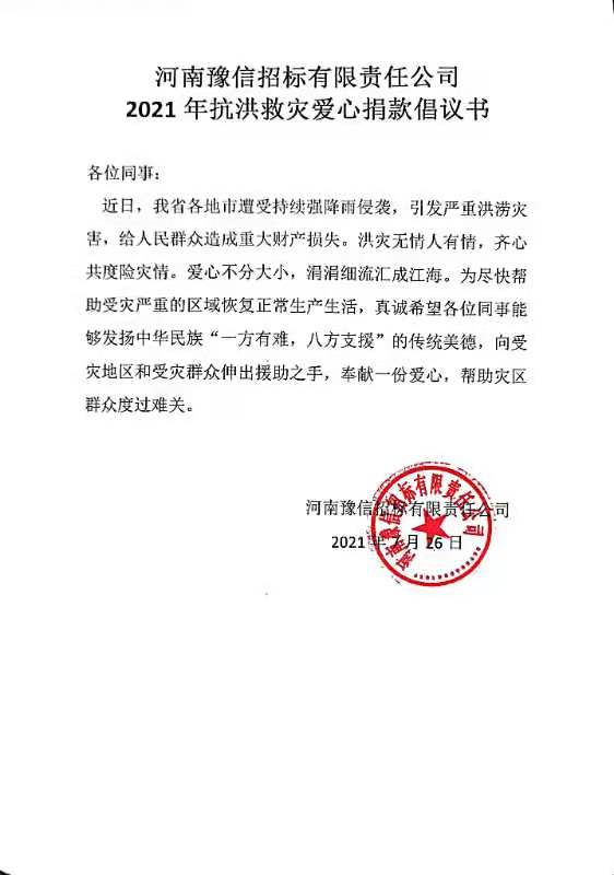 受超強降雨影響,目前河南省內(nèi)抗洪救災(zāi)仍在繼續(xù)!我省仍有多地汛情嚴峻,身為河南本土國有企業(yè),河南豫信招標有限責任公司 號召 公司干部職工 以實際行動幫助災(zāi)區(qū)人民抗洪救災(zāi)、重建家園 。