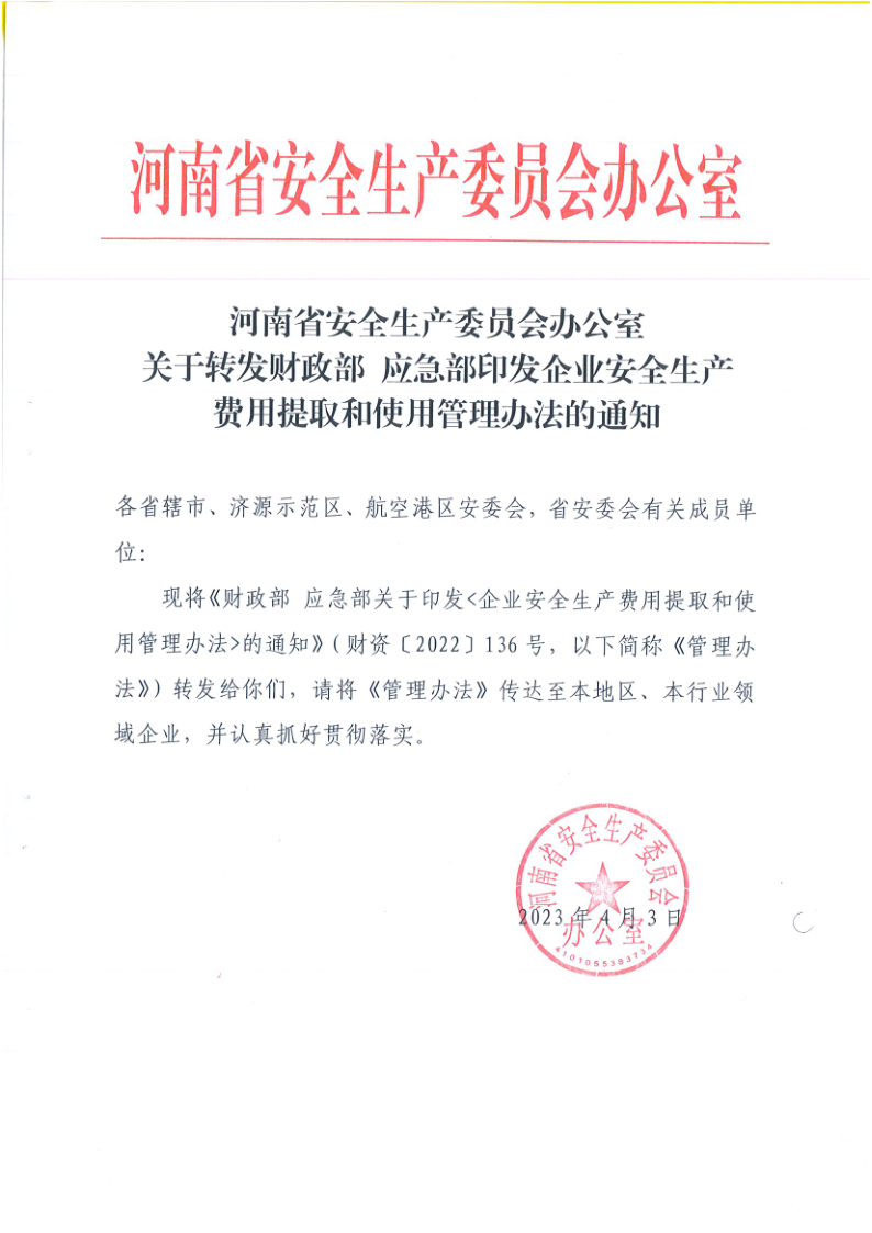關(guān)于轉(zhuǎn)發(fā)財(cái)政部應(yīng)急部印發(fā)企業(yè)安全生產(chǎn)費(fèi)用提取和使用管理辦法的通知