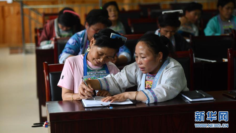 在烏英苗寨,黨鳩村村委會副主任梁秀平(右)在研究“雙語雙向”培訓(xùn)班的課堂內(nèi)容(6月18日攝)。新華社記者 黃孝邦 攝