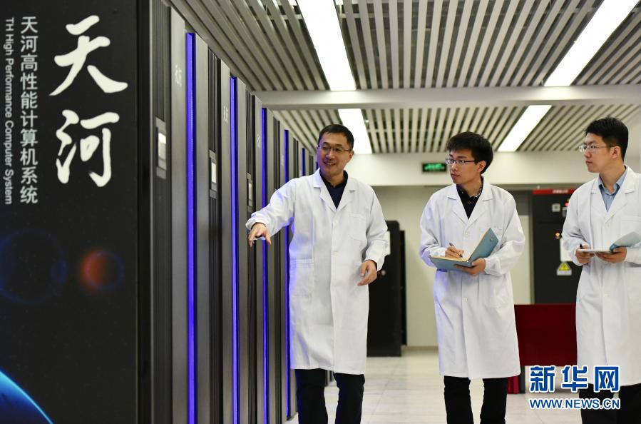 在國家超級(jí)計(jì)算天津中心“天河三號(hào)”原型機(jī)機(jī)房?jī)?nèi),應(yīng)用研發(fā)部部長(zhǎng)孟祥飛(左)和同事一起巡查(2019年4月24日攝)。新華社記者 李然 攝