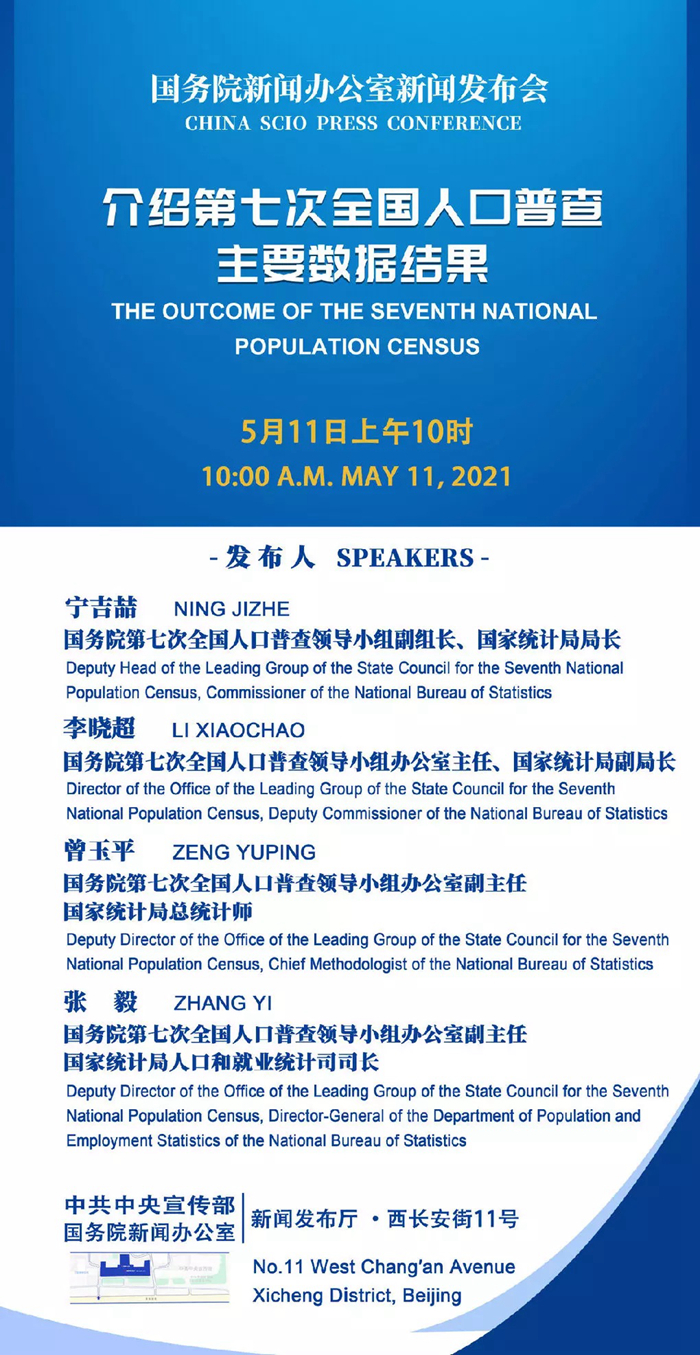 國(guó)務(wù)院新聞辦公室定于2021年5月11日上午10時(shí)舉行新聞發(fā)布會(huì),請(qǐng)國(guó)務(wù)院第七次全國(guó)人口普查領(lǐng)導(dǎo)小組副組長(zhǎng)、國(guó)家統(tǒng)計(jì)局局長(zhǎng)寧吉喆,國(guó)務(wù)院第七次全國(guó)人口普查領(lǐng)導(dǎo)小組辦公室主任、國(guó)家統(tǒng)計(jì)局副局長(zhǎng)李曉超,國(guó)務(wù)院第七次全國(guó)人口普查領(lǐng)導(dǎo)小組辦公室副主任、國(guó)家統(tǒng)計(jì)局總統(tǒng)計(jì)師曾玉平,國(guó)務(wù)院第七次全國(guó)人口普查領(lǐng)導(dǎo)小組辦公室副主任、國(guó)家統(tǒng)計(jì)局人口和就業(yè)統(tǒng)計(jì)司司長(zhǎng)張毅介紹第七次全國(guó)人口普查主要數(shù)據(jù)結(jié)果,并答記者問(wèn)。