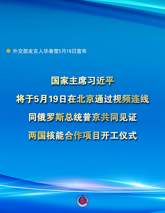 新華社北京5月18日電 外交部發(fā)言人華春瑩18日宣布:國家主席習近平將于5月19日在北京通過視頻連線,同俄羅斯總統普京共同見證兩國核能合作項目開工儀式。