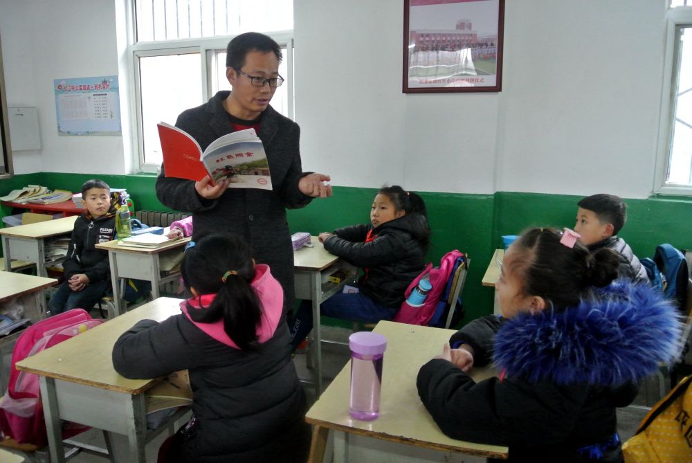 陜西省銅川市照金北梁紅軍小學(xué)副校長(zhǎng)陶建剛給孩子們講《紅色照金》(2018年12月4日攝)。新華社記者 梁愛(ài)平 攝