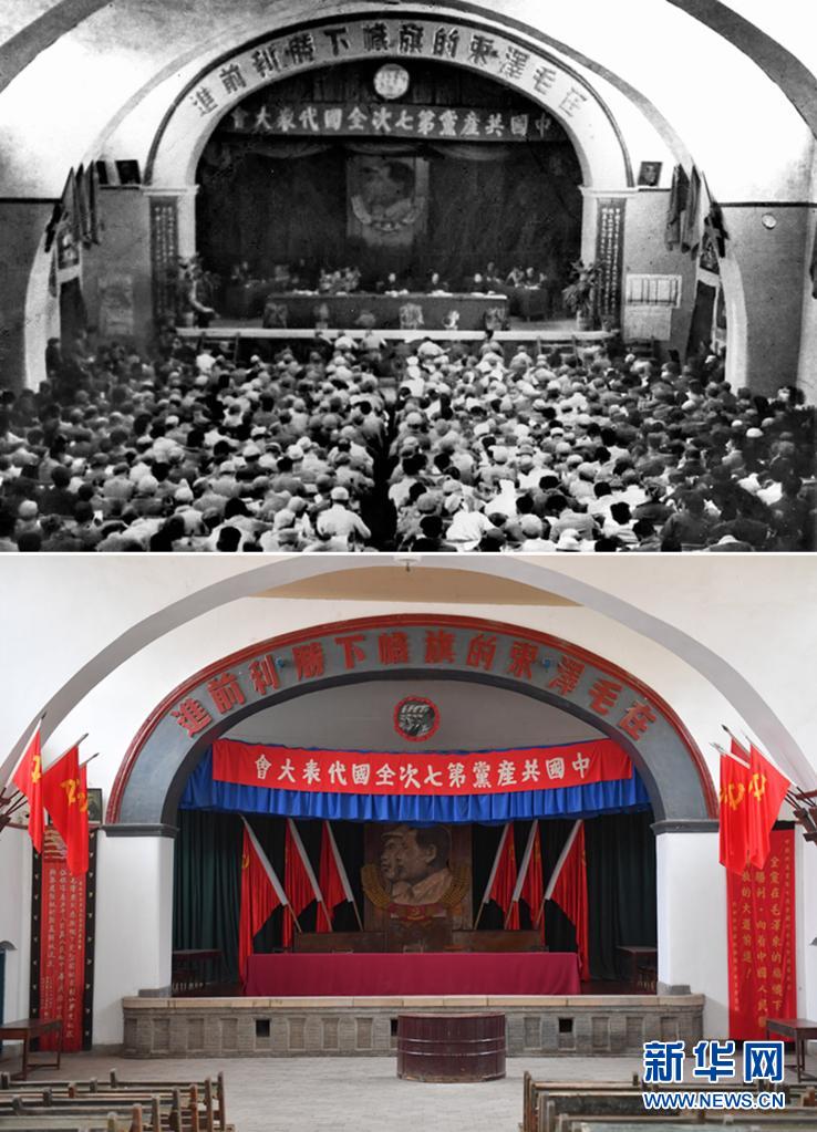 拼版照片:上圖為中國(guó)共產(chǎn)黨第七次全國(guó)代表大會(huì)會(huì)場(chǎng)(資料照片,新華社發(fā));下圖為2021年3月31日拍攝的位于延安市楊家?guī)X革命舊址的中國(guó)共產(chǎn)黨第七次全國(guó)代表大會(huì)會(huì)場(chǎng)(新華社記者張博文攝)。新華社發(fā)
