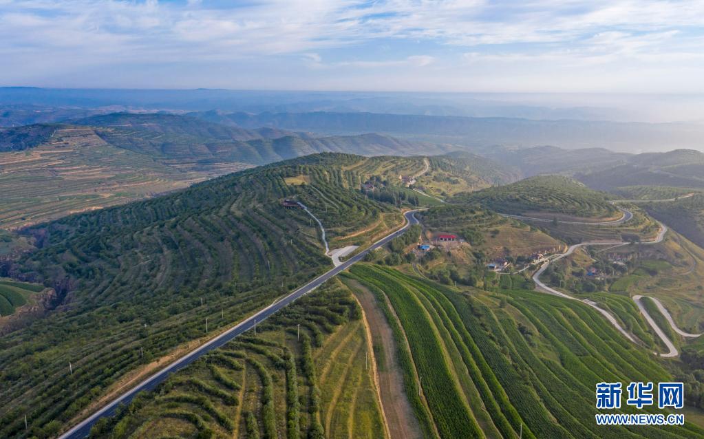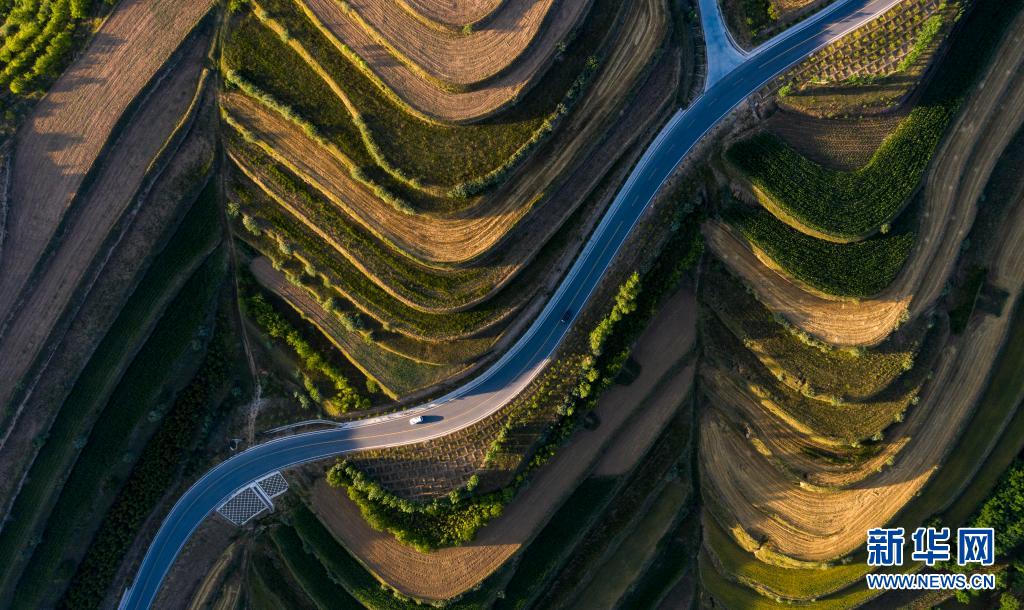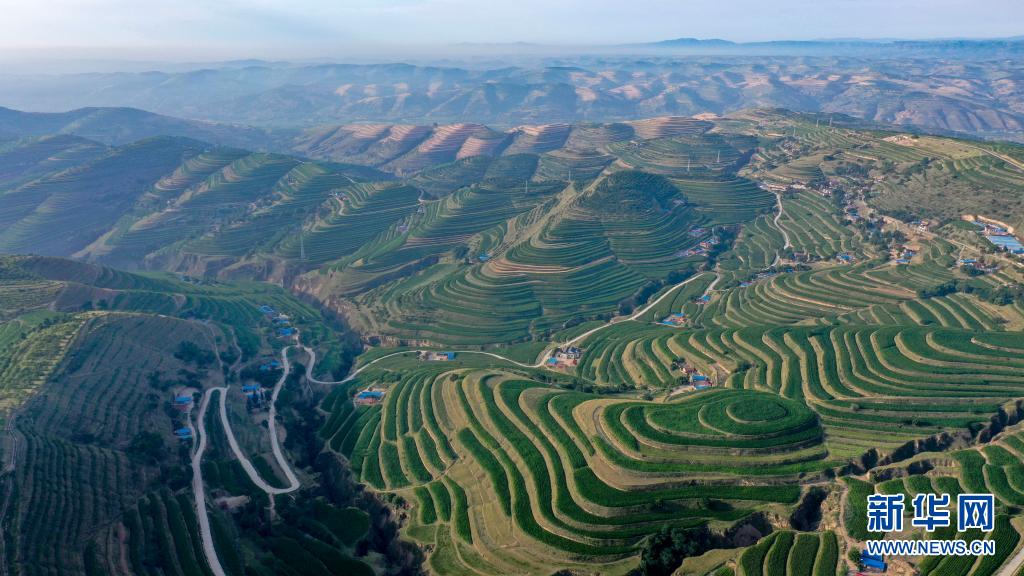 這是7月13日在寧夏固原市彭陽縣拍攝的青云灣旱作梯田公園(無人機照片)。新華社記者 馮開華 攝
