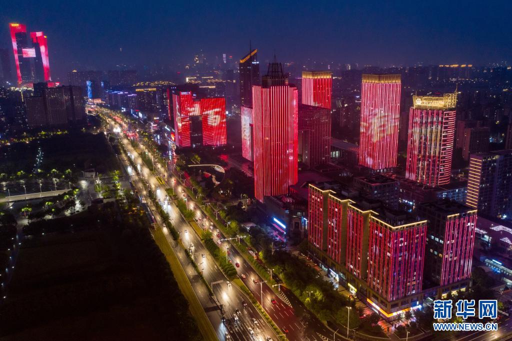 這是6月25日在南京市河西新城中軸線(xiàn)拍攝的慶祝建黨百年主題燈光秀(無(wú)人機(jī)照片)。新華社記者 李博 攝