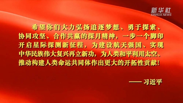 ?? 習(xí)近平總書記曾用“追逐夢(mèng)想、勇于探索、協(xié)同攻堅(jiān)、合作共贏”這16個(gè)字高度概括總結(jié)了“探月精神”,勉勵(lì)航天工作者們一步一個(gè)腳印開啟星際探測(cè)新征程,為建設(shè)航天強(qiáng)國(guó)、實(shí)現(xiàn)中華民族偉大復(fù)興再立新功。