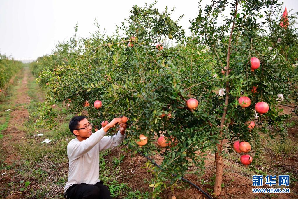 在河南省南陽市淅川縣九重鎮(zhèn),軟籽石榴基地的工作人員在采摘石榴(2019年10月19日攝)。新華社記者 馮大鵬 攝