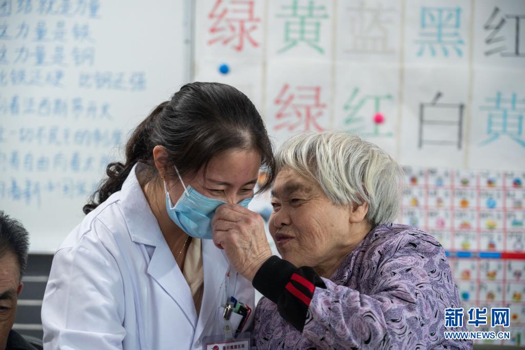 在湖南省邵陽市隆回縣隆回魏源醫(yī)院,一名老年公寓的老人跟醫(yī)護人員親密交流(2020年10月12日攝)。新華社記者 才揚 攝