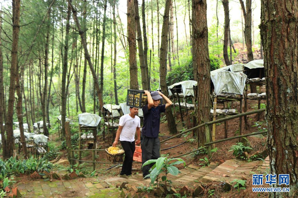當(dāng)?shù)厝罕娫谫F州省六盤水市六枝特區(qū)月亮河鄉(xiāng)的花德河國(guó)有林場(chǎng)內(nèi)收獲菌類(2021年7月24日攝)。 新華社發(fā)(令狐榮駿 攝)