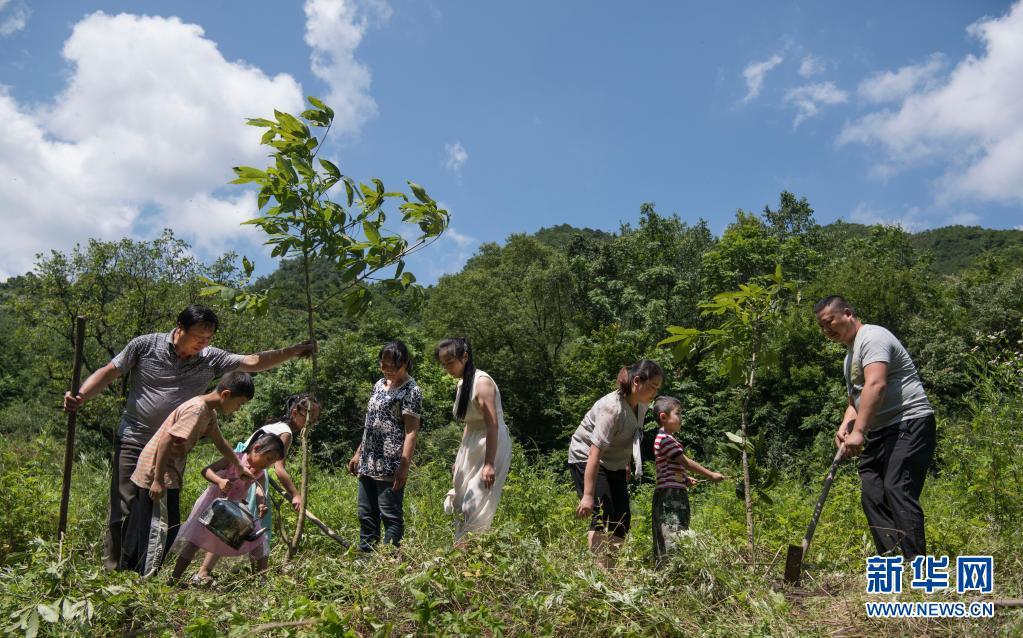 姚祖元(右一)與家人一起種樹(2019年7月13日攝)。在秦嶺深處的陜西省漢中市留壩縣火燒店鎮(zhèn),姚家5代人歷時(shí)70年深耕秦嶺的故事在當(dāng)?shù)丶矣鲬魰裕瑐鳛榧言挕?/span> 新華社記者 陶明 攝