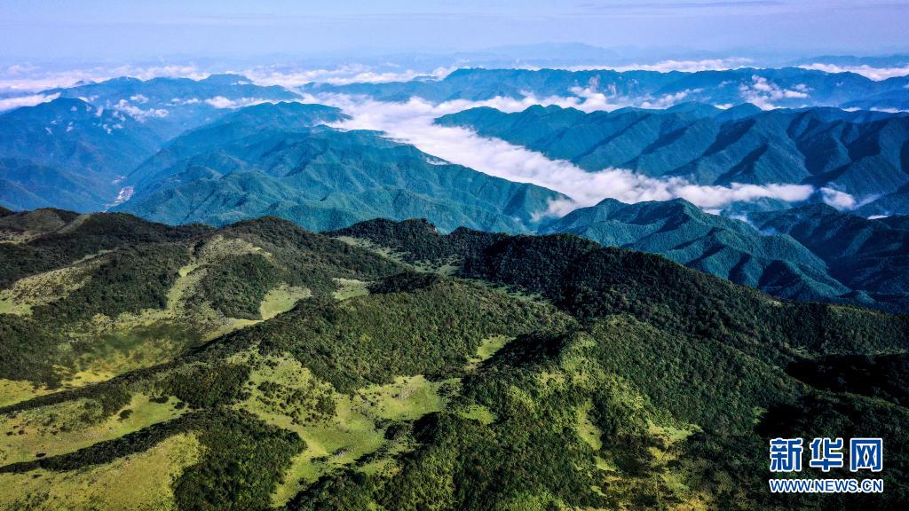 雨后初霽,位于陜西省漢中市留壩縣的紫柏山國(guó)家森林公園內(nèi)云霧升騰,宛如畫境(2020年9月17日攝,無(wú)人機(jī)照片)。 新華社記者 劉瀟 攝