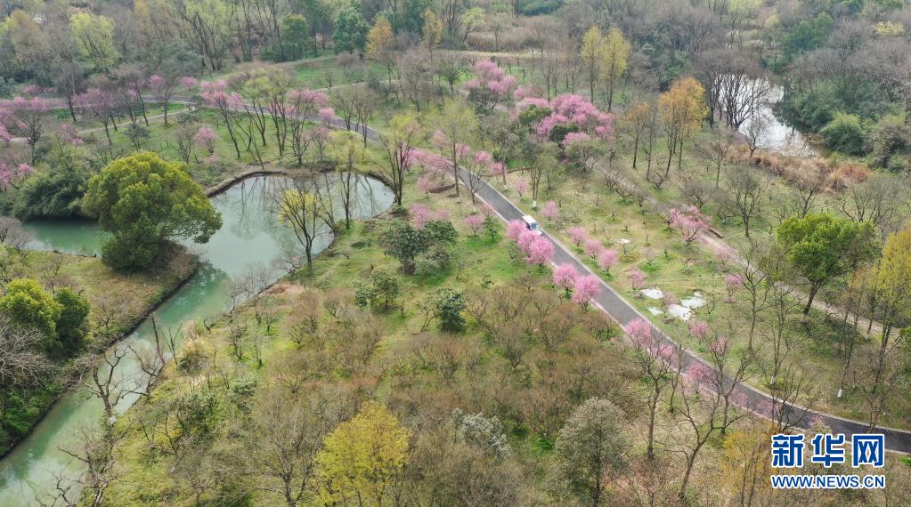 觀光車在浙江杭州西溪濕地內(nèi)行駛(2021年3月2日攝,無(wú)人機(jī)照片)。 新華社記者 翁忻旸 攝
