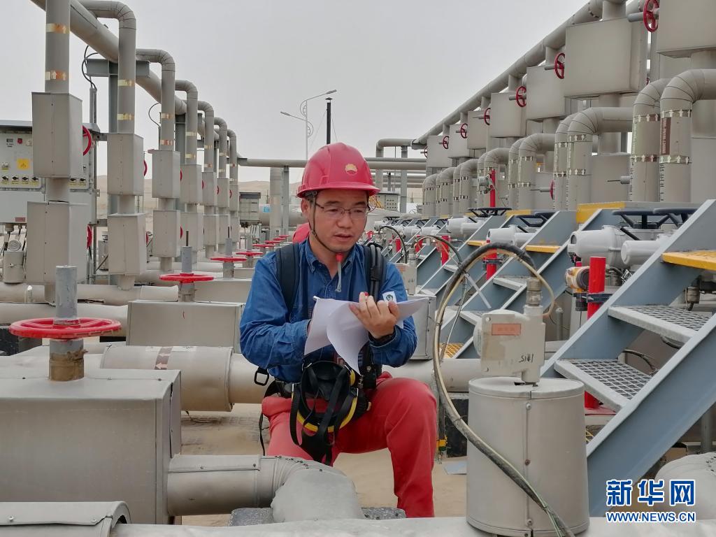 7月31日,馮光在塔里木油田塔中1號集氣站核對遠傳工藝參數(shù)。新華社發(fā)