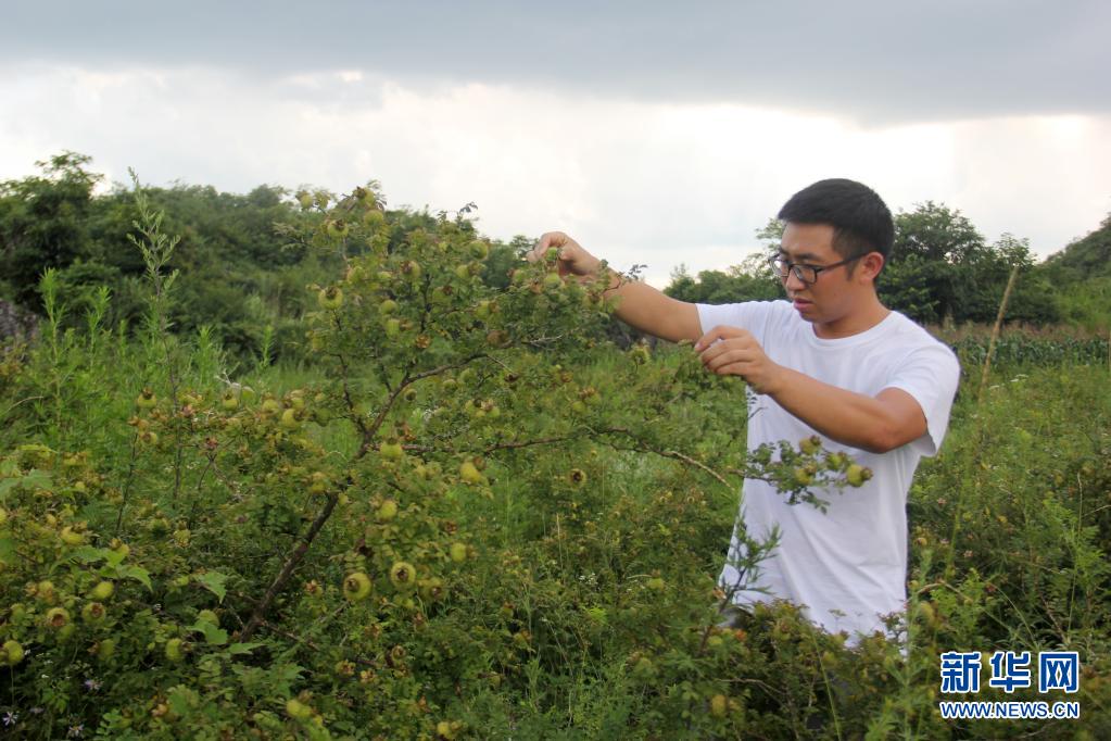 7月26日,在貴州省六枝特區(qū)新窯鎮(zhèn)播雨村,楊崗在查看刺梨的生長情況。新華社記者 潘德鑫 攝