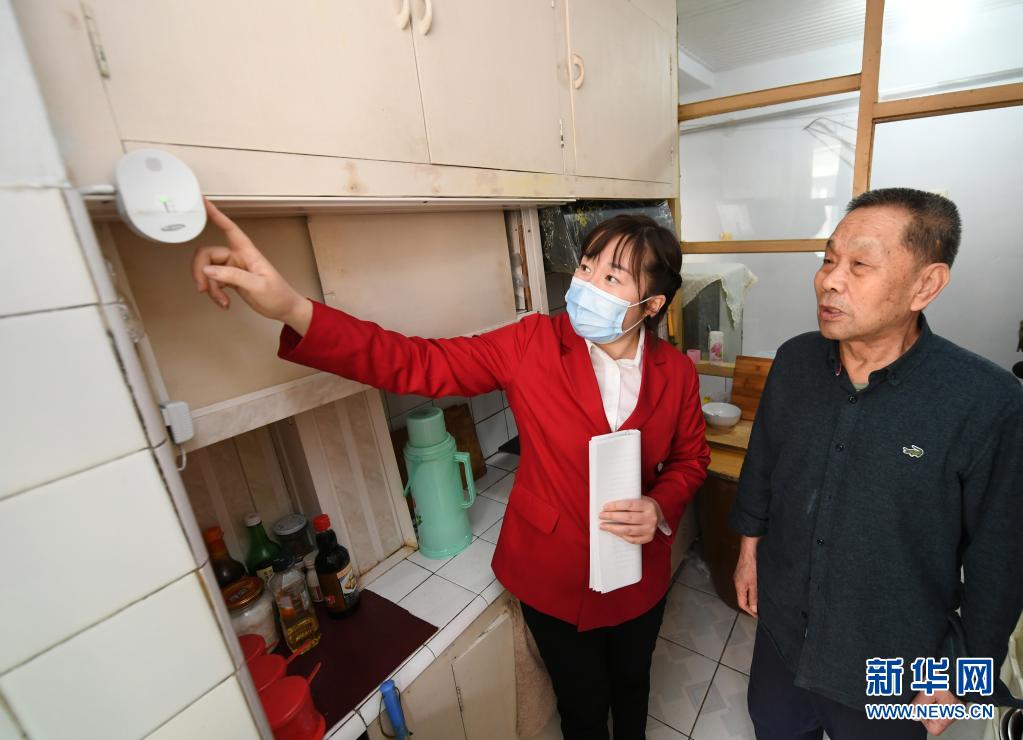 吉林省長春市長山花園社區(qū)黨委書記韓麗萍(左)到獨居老人家中檢查燃氣報警設(shè)備(資料照片)。新華社發(fā)