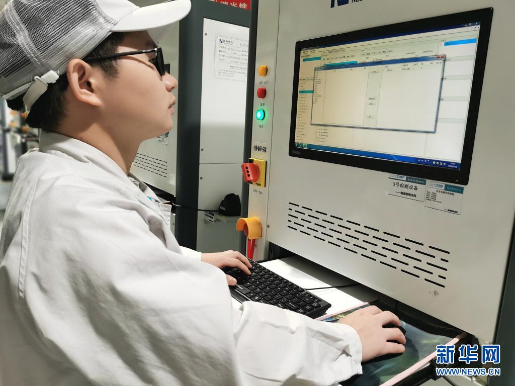 7月20日,在廣州廣汽埃安新能源汽車有限公司動力電池車間,電池支持工程師周林在調(diào)試動力電池檢測設(shè)備。新華社發(fā)