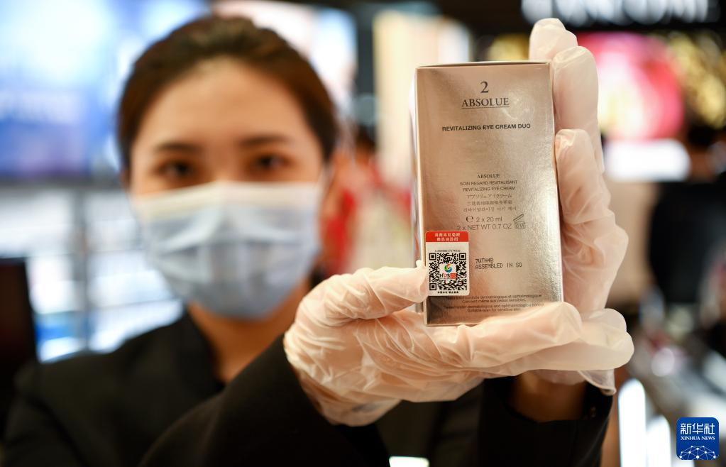 7月31日,海口日月廣場(chǎng)免稅店工作人員展示加貼溯源碼的商品。新華社記者 郭程 攝