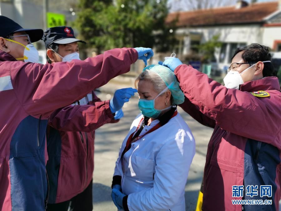 4月4日,中國赴塞爾維亞抗疫醫(yī)療專家組在貝爾格萊德的基層發(fā)熱門診走訪時,幫助塞爾維亞醫(yī)生特里富諾維奇(中)佩戴高標(biāo)準(zhǔn)的防護(hù)口罩。新華社發(fā)