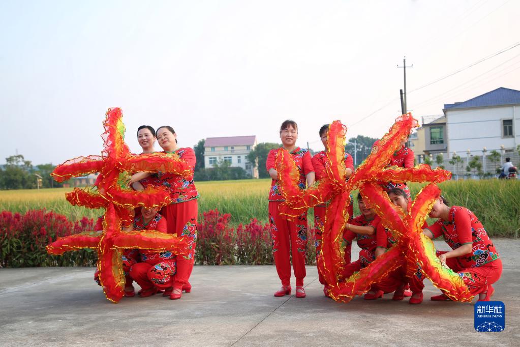 在湖南省汨羅市汨羅鎮(zhèn)九雁村稻田旁的小廣場上,村里的婦女們在排練以豐收為主題的廣場舞(9月17日攝)。新華社發(fā)(胡清 攝)