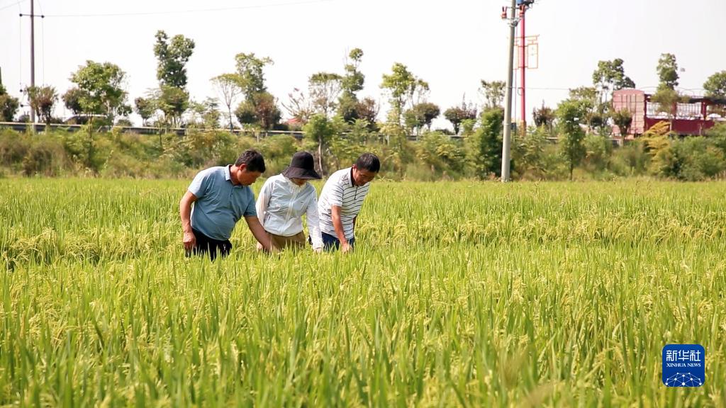 在汨羅鎮(zhèn)江景村,汨羅市農業(yè)農村局的兩名技術人員正查看“泰優(yōu)390”的結實率。根據各家情況,他們向村民們科普如何更好地做到綠色病蟲害防控、調整農藥和化肥用量。
