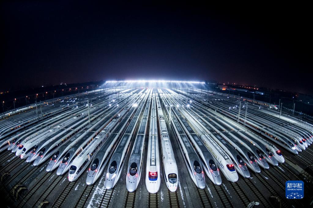 動(dòng)車組??吭谖錆h動(dòng)車段的存車線上,準(zhǔn)備進(jìn)行檢修和保溫作業(yè)(2018年2月1日攝)。新華社記者 肖藝九 攝