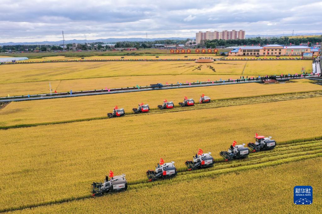 在吉林省長(zhǎng)春市九臺(tái)區(qū)龍嘉街道紅光村,農(nóng)民駕駛農(nóng)機(jī)進(jìn)行水稻收割作業(yè)(9月23日攝,無(wú)人機(jī)照片)。新華社記者 張楠 攝