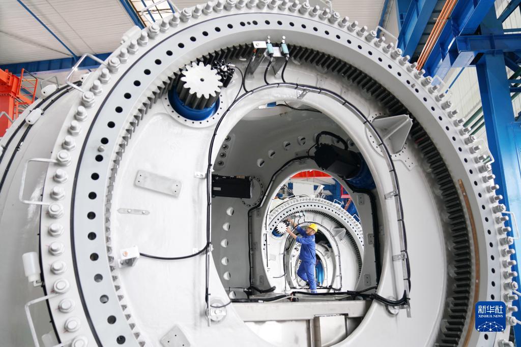 在位于黑龍江省齊齊哈爾市的中國(guó)一重集團(tuán)有限公司風(fēng)電裝備生產(chǎn)制造廠生產(chǎn)車間,工人在進(jìn)行生產(chǎn)作業(yè)(7月1日攝)。新華社記者 王建威 攝