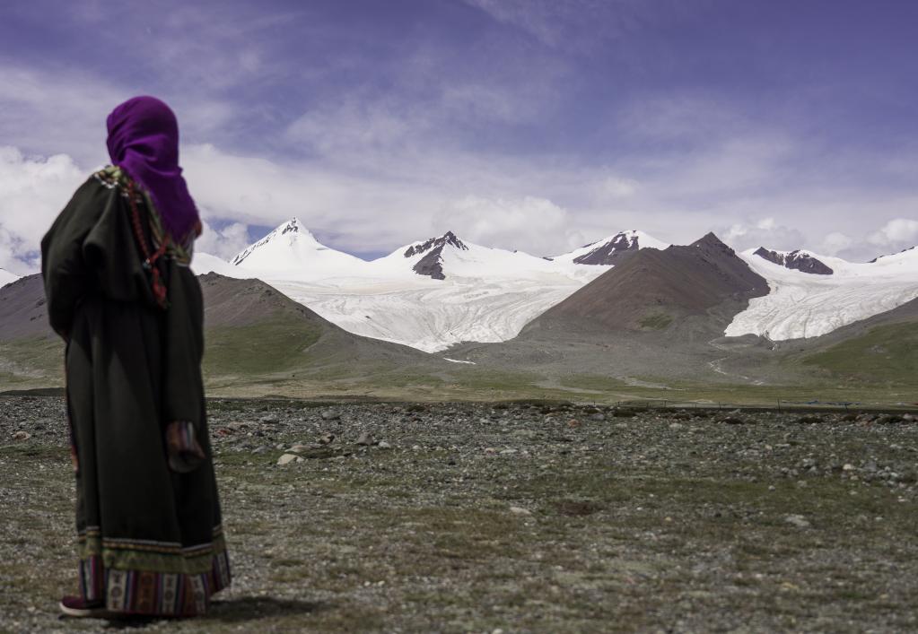 2020年8月15日,在青海省玉樹(shù)藏族自治州,牧民在雪山腳下遠(yuǎn)眺崗加曲巴冰川。新華社記者吳剛攝