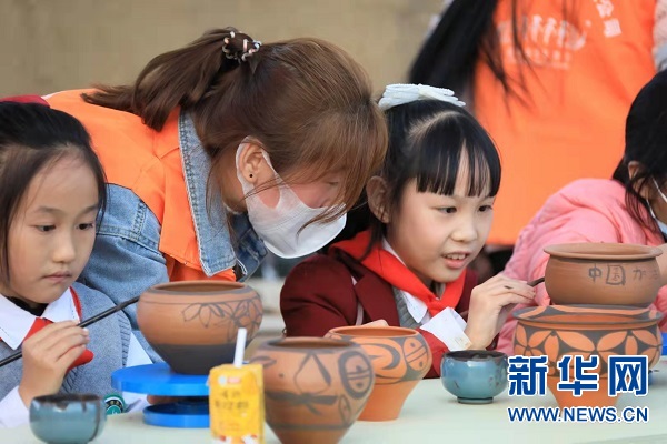 小朋友在仰韶村國(guó)家考古遺址公園參與彩陶制作。(聶金鋒 攝)