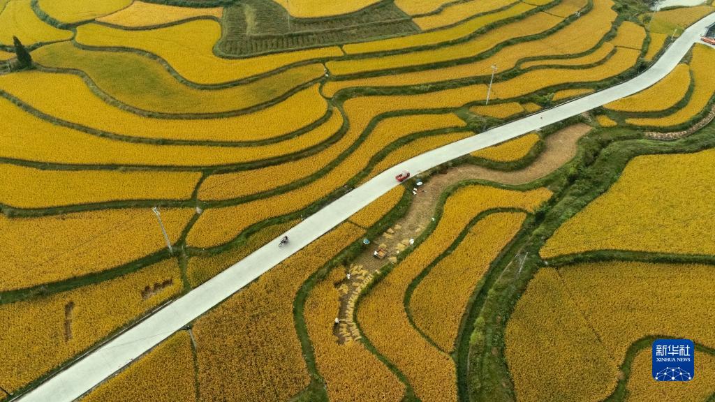 9月12日,農(nóng)民在貴州省龍里縣灣灘河鎮(zhèn)金批村稻田里收獲稻谷(無(wú)人機(jī)照片)。新華社發(fā)(龍毅 攝)