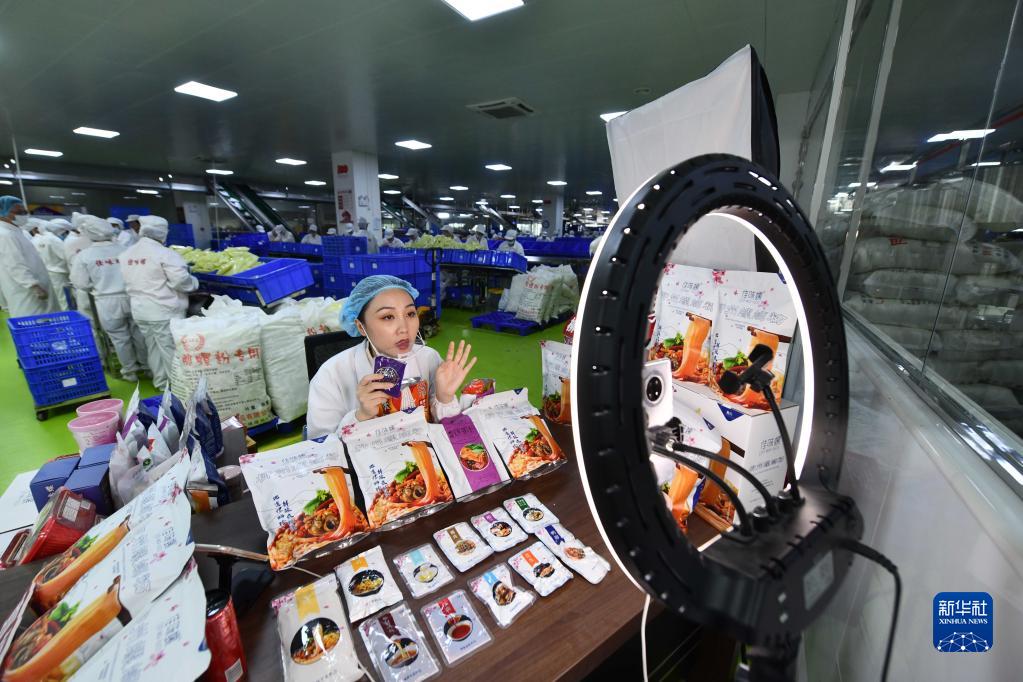 在廣西一家螺螄粉生產(chǎn)車(chē)間,工作人員在直播銷(xiāo)售螺螄粉(6月17日攝)。新華社記者 黃孝邦 攝