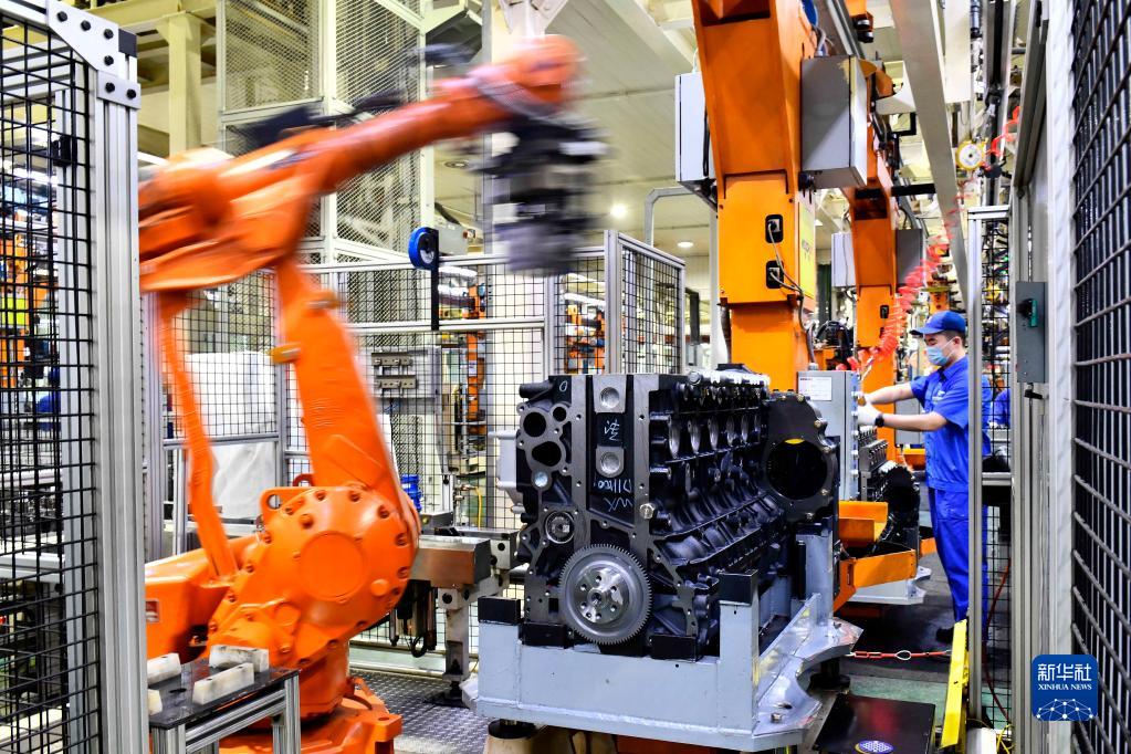 在位于山東濰坊的濰柴集團(tuán)總裝車(chē)間,工人在流水線上裝配發(fā)動(dòng)機(jī)(4月22日攝)。新華社記者 郭緒雷 攝