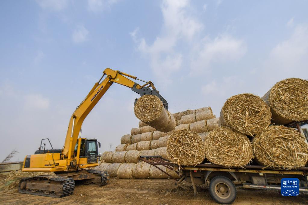 2020年11月12日,在吉林省四平市福港秸稈收儲有限公司,農(nóng)業(yè)機械搬運打包好的秸稈。新華社記者 張楠 攝