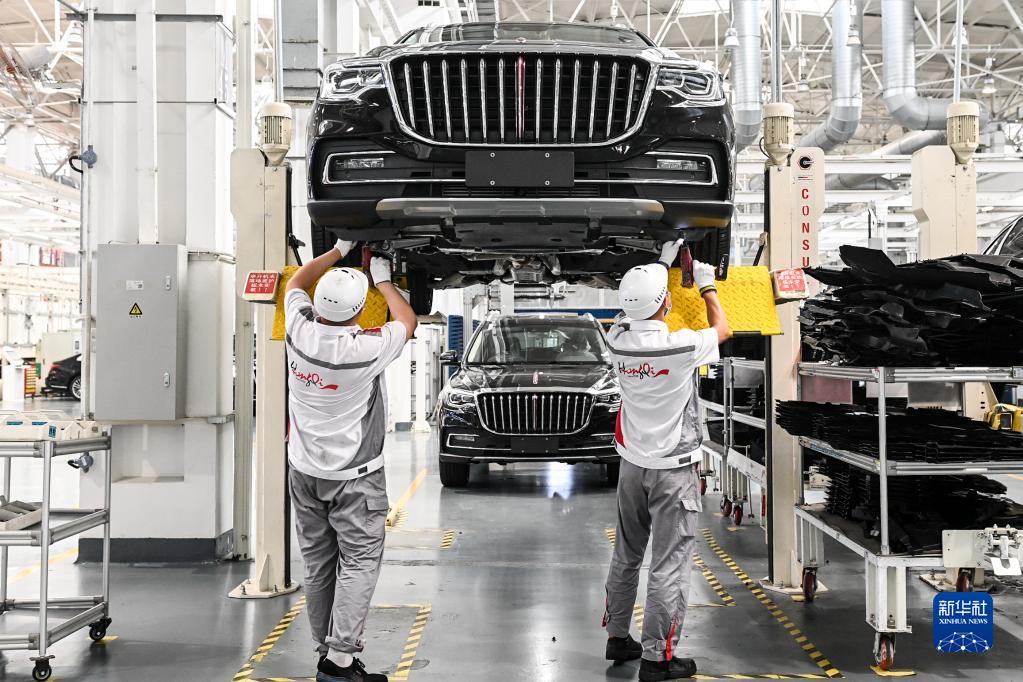 7月1日,工人在位于吉林長春的一汽紅旗工廠總裝車間內(nèi)裝配車輛。新華社記者 顏麟蘊 攝