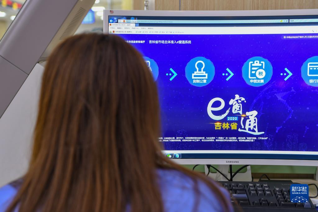 在吉林省四平市政務(wù)大廳,工作人員通過“e窗通”系統(tǒng)為企業(yè)負責(zé)人服務(wù)(2020年9月8日攝)。新華社記者 張楠 攝
