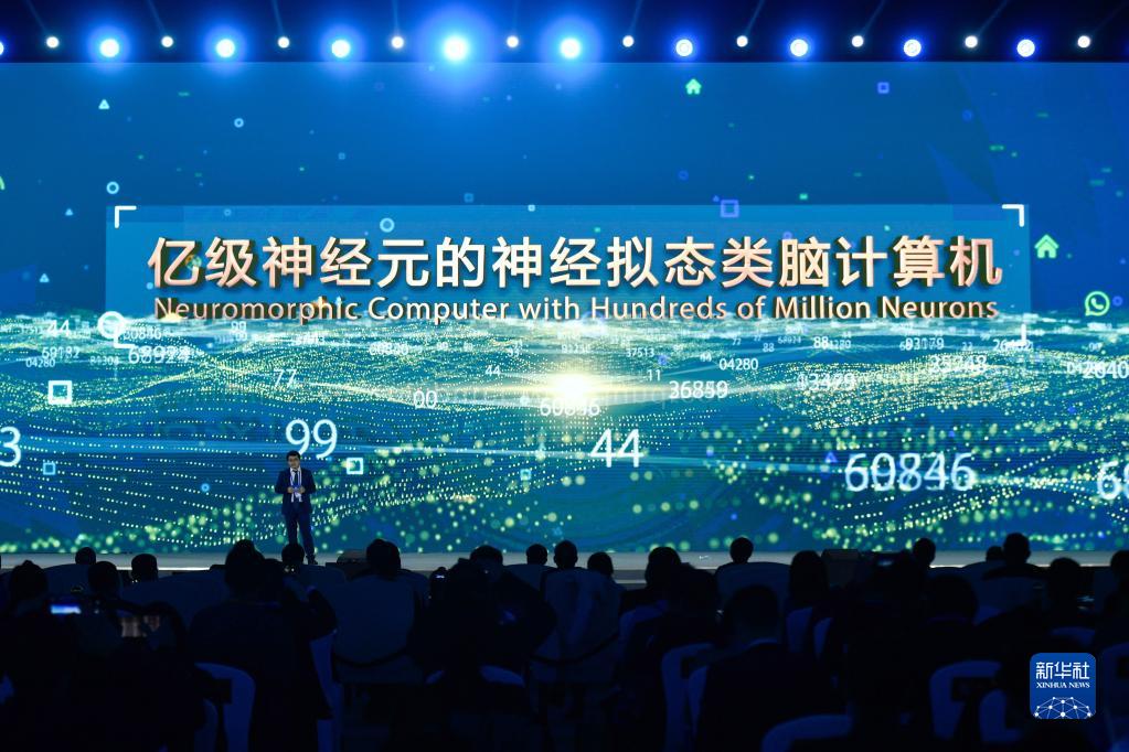 浙江大學(xué)、之江實(shí)驗(yàn)室代表在“世界互聯(lián)網(wǎng)領(lǐng)先科技成果發(fā)布”活動(dòng)上介紹“億級神經(jīng)元的神經(jīng)擬態(tài)類腦計(jì)算機(jī)”(2020年11月23日攝)。新華社記者 黃宗治 攝