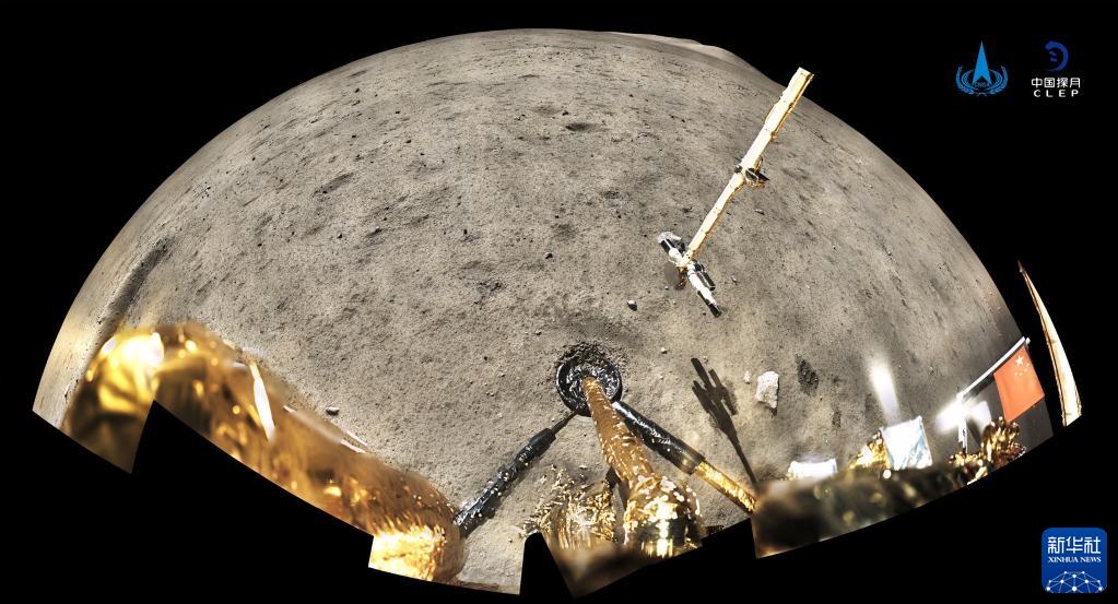 2020年12月4日,國家航天局公布了探月工程嫦娥五號探測器在月球表面國旗展示的照片。嫦娥五號著陸器和上升器組合體全景相機環(huán)拍成像,五星紅旗在月面成功展開,此外圖像上方可見已完成表取采樣的機械臂及采樣器。新華社發(fā)(國家航天局供圖)