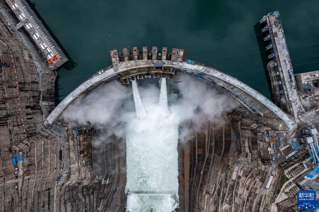 俯瞰白鶴灘水電站(無人機照片,6月28日攝)。金沙江白鶴灘水電站首批機組于6月28日安全準點投產發(fā)電。新華社記者 江文耀 攝