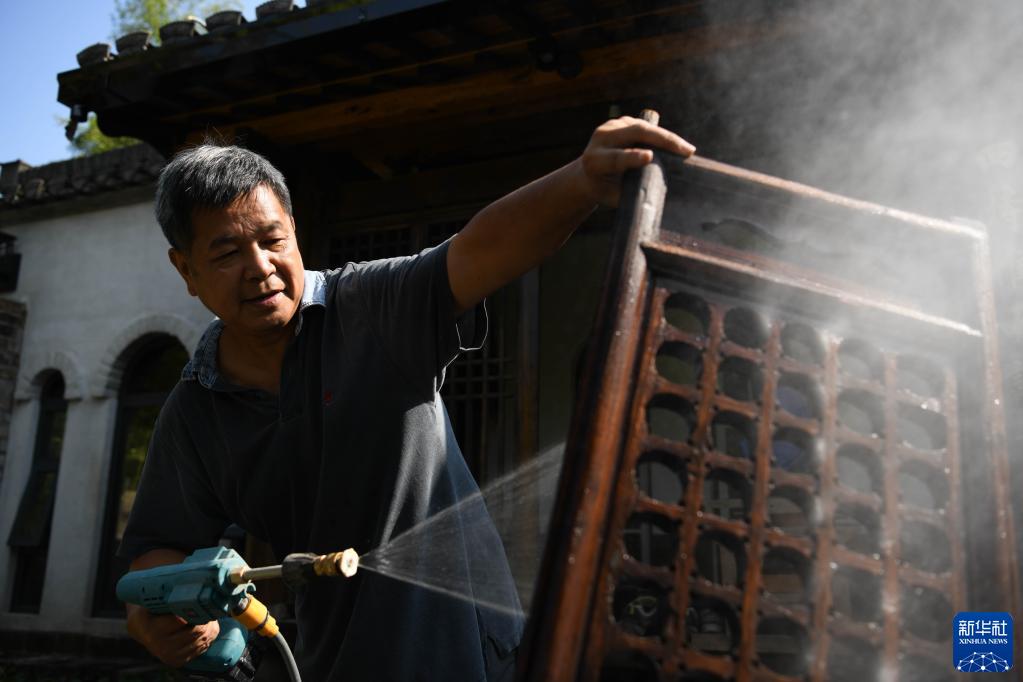 9月16日,在安徽省黃山市徽州區(qū)巖寺鎮(zhèn)石際村,張真鋼清洗收集來(lái)的舊門窗。新華社記者 張端 攝