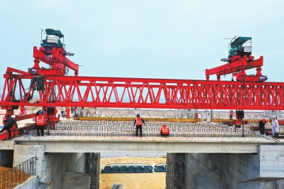 大別山革命老區(qū)引淮供水灌溉工程樞紐工程節(jié)制閘交通橋安全架設(shè)完成。 譚勇 李自洲 攝