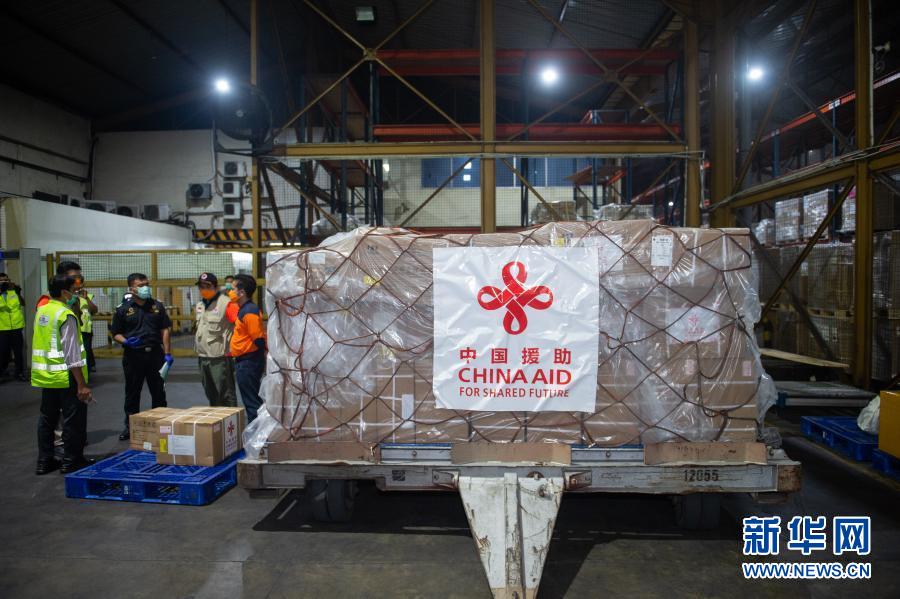 3 月 26 日,中國援助印度尼西亞的首批抗疫物資停放在雅加達蘇加諾哈達機場倉庫。新華社記者 杜宇 攝