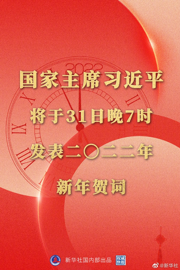 新華社北京12月30日電 國家主席習(xí)近平將于31日晚7時(shí)通過中央廣播電視總臺(tái)和互聯(lián)網(wǎng),發(fā)表二〇二二年新年賀詞。中央廣播電視總臺(tái)所屬中央電視臺(tái)綜合頻道、新聞?lì)l道、中文國際頻道、4K頻道,中國國際電視臺(tái)各外語頻道,中央人民廣播電臺(tái),中國國際廣播電臺(tái),以及人民網(wǎng)、新華網(wǎng)、央視新聞客戶端等中央主要新聞媒體所屬網(wǎng)站、新媒體平臺(tái)將準(zhǔn)時(shí)播出。