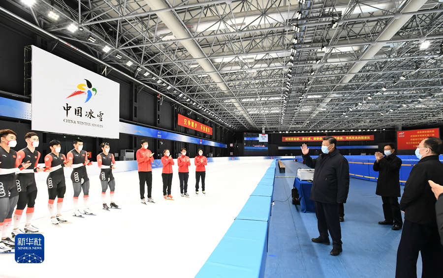 1月4日,中共中央總書記、國家主席、中央軍委主席習(xí)近平在北京考察2022年冬奧會(huì)、冬殘奧會(huì)籌辦備賽工作。這是4日下午,習(xí)近平在二七廠冰雪項(xiàng)目訓(xùn)練基地速滑館,向參訓(xùn)運(yùn)動(dòng)員、教練員表示慰問。新華社記者 謝環(huán)馳 攝