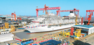 日前,中國首制大型郵輪在中國船舶集團旗下上海外高橋造船有限公司船塢內(nèi)順利實現(xiàn)塢內(nèi)起浮。這是大型郵輪建造的重要節(jié)點,標(biāo)志著該項目向著完工交付的總目標(biāo)邁出關(guān)鍵一步。去年末,中國船舶集團總部由北京遷往上海。本報記者 沈文敏攝