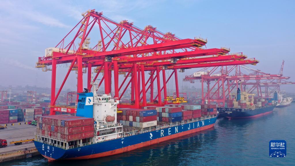1月26日,貨輪??吭谏綎|日照港集裝箱碼頭進(jìn)行裝卸作業(yè)(無(wú)人機(jī)照片)。新華社記者 郭緒雷 攝