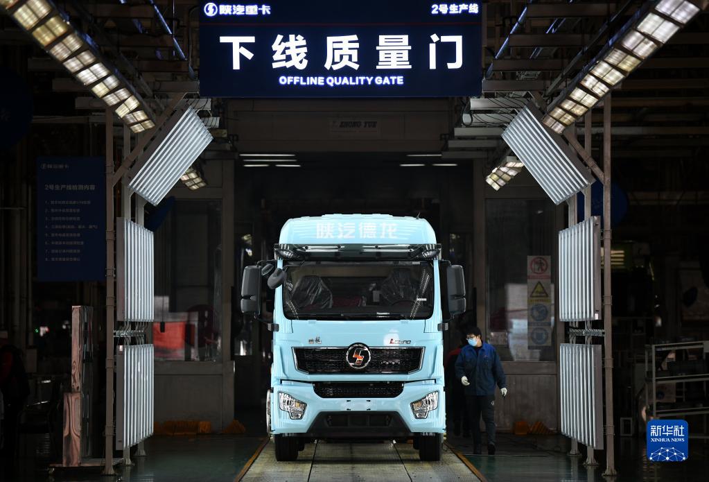 1月20日,工作人員在陜西汽車(chē)控股集團(tuán)有限公司總裝車(chē)間驗(yàn)收一輛裝配完畢的重型卡車(chē)。新華社記者 李一博 攝