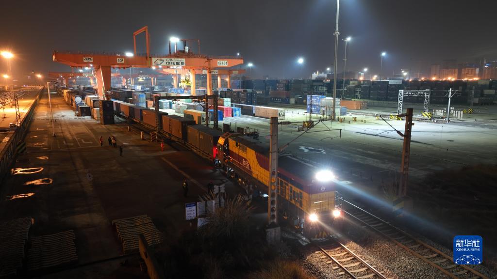 這是1月28日晚在成都拍攝的中歐班列(無(wú)人機(jī)照片)。新華社發(fā)(白桂斌 攝)