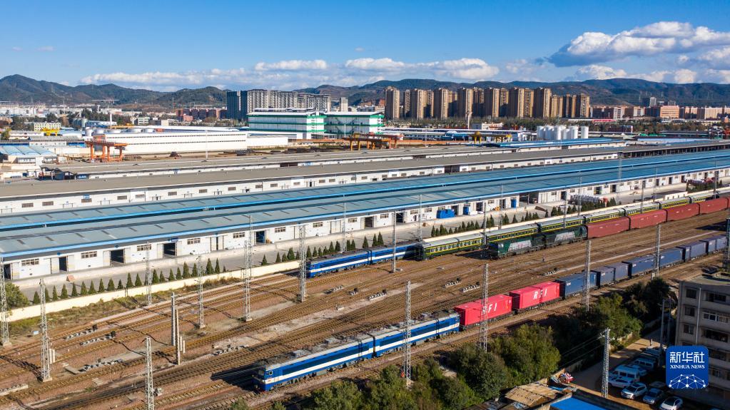 1月1日,滿載30個(gè)標(biāo)準(zhǔn)集裝箱的中老鐵路新年首趟國(guó)際貨物列車(chē)(前)從昆明開(kāi)往老撾萬(wàn)象(無(wú)人機(jī)照片)。新華社記者 胡超 攝