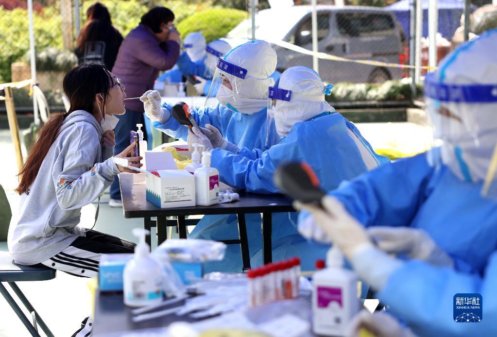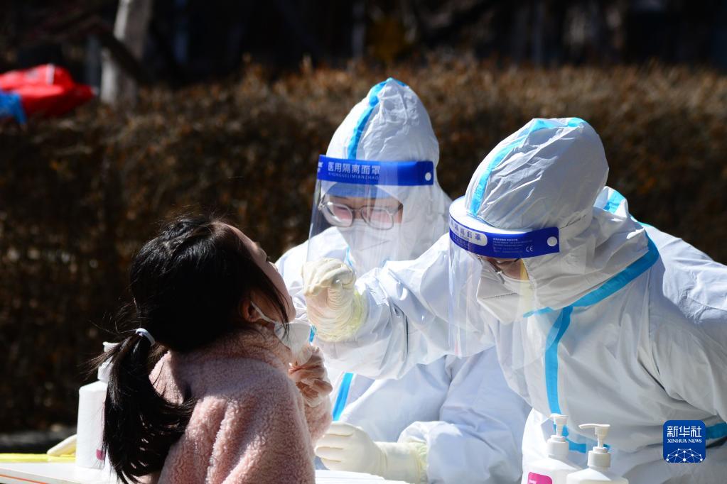 4月7日,在長春市南關(guān)區(qū)一處核酸檢測點,醫(yī)務(wù)人員為居民進(jìn)行核酸采樣。新華社記者 張建 攝